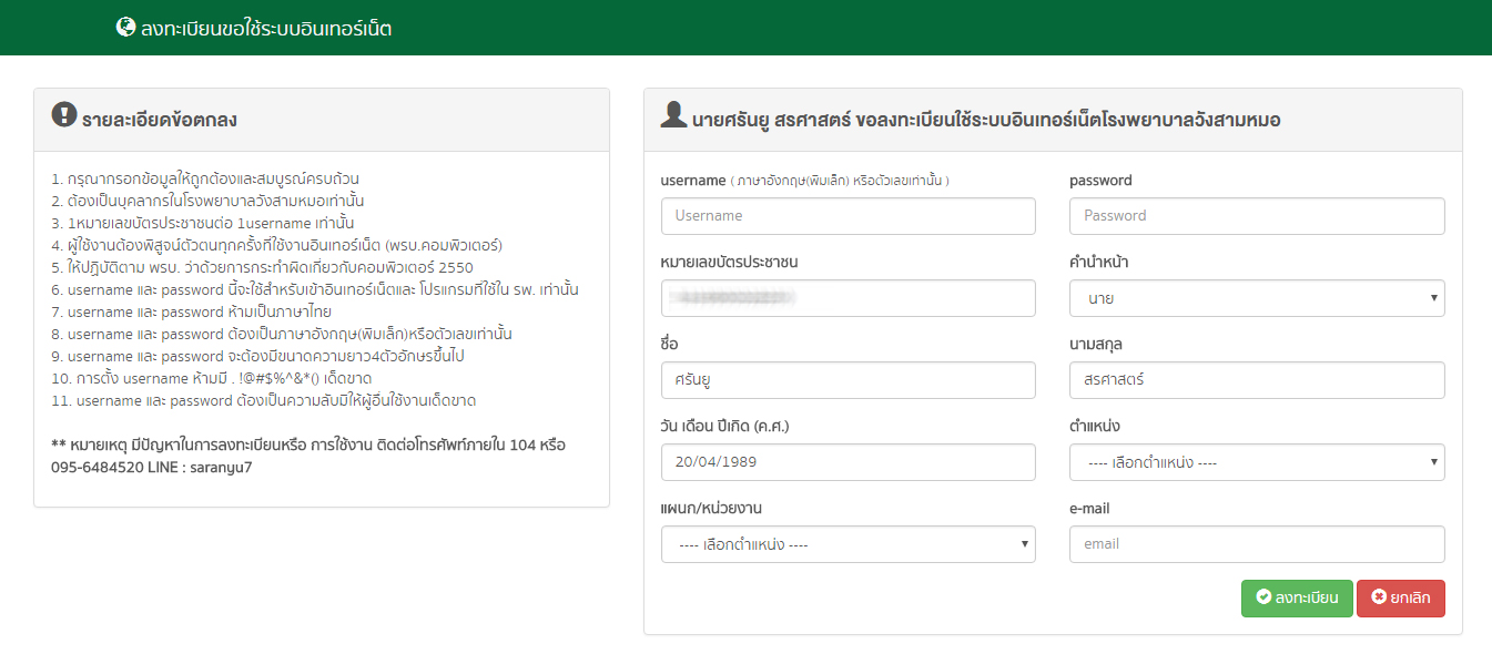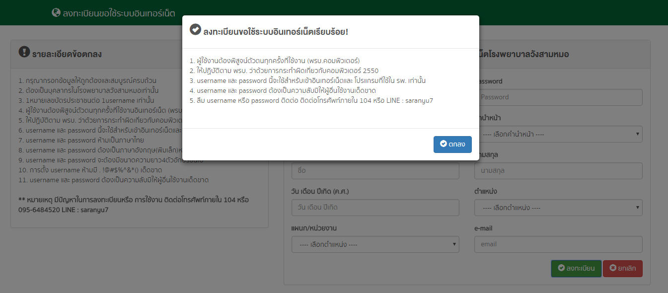 ** หมายเหตุ มีปัญหาในการลงทะเบียนหรือ การใช้งาน ติดต่อโทรศัพท์ภายใน 104 หรือ 095-6484520 LINE : saranyu7